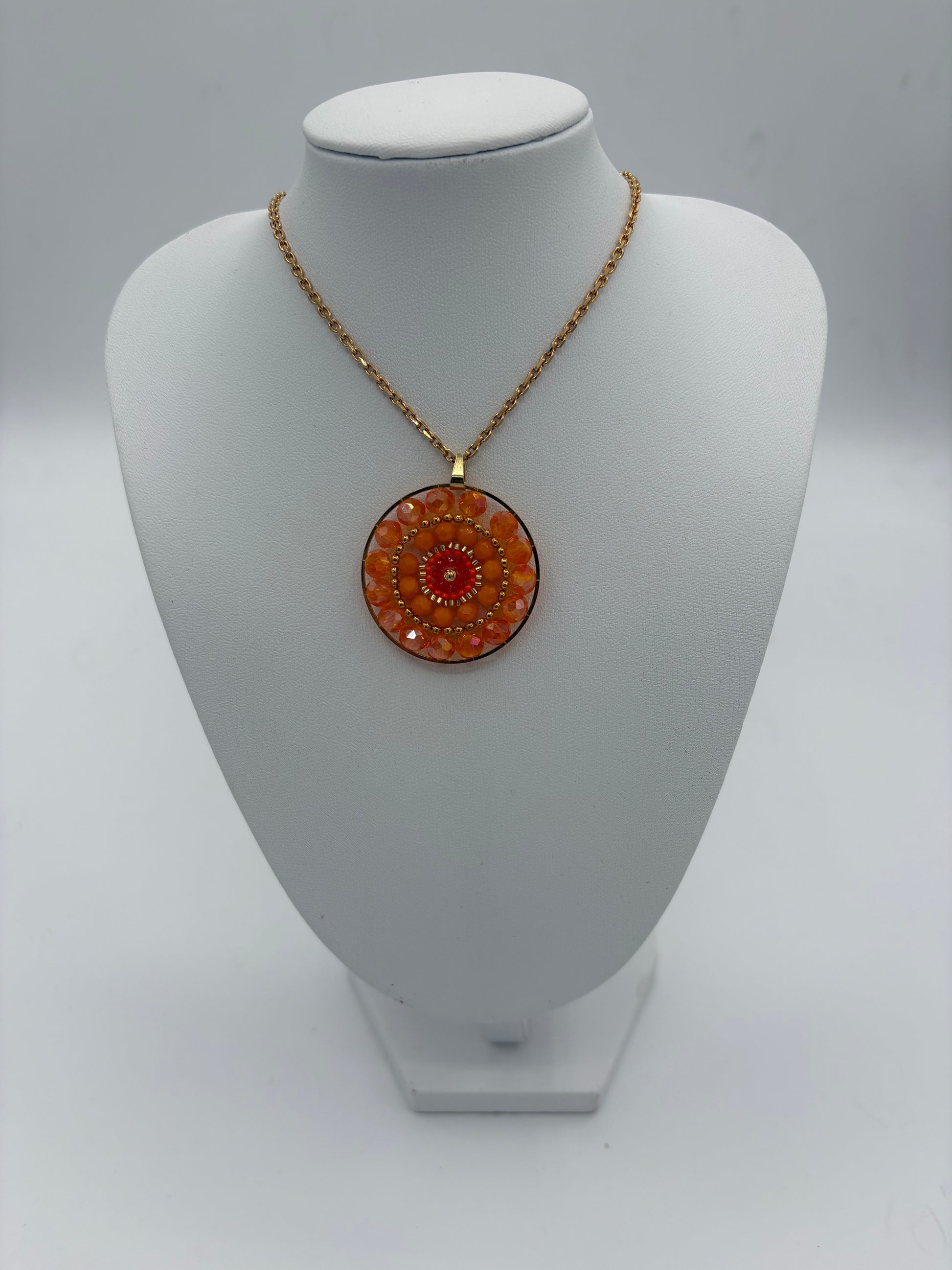 Pendentif rond en tissage composé de perles de verre facettées dans des tons orange et corail, associés à de petites perles Miyuki et des perles dorées.