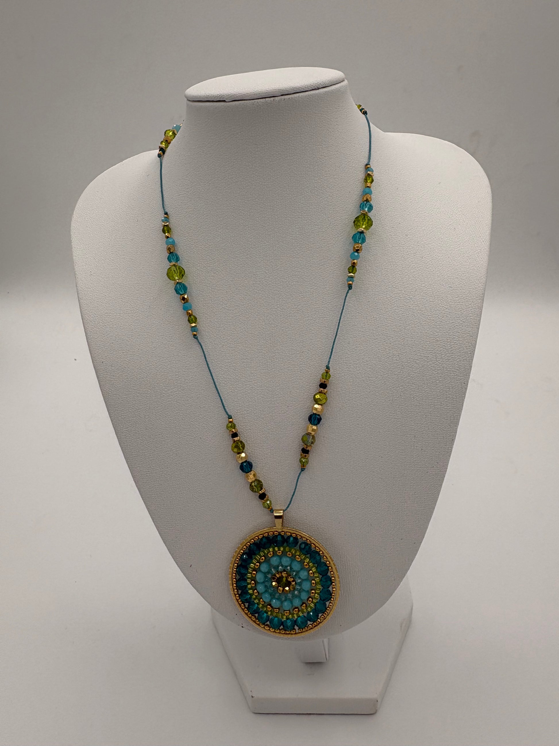 Pendentif rond en tissage composé de perles de verre facettées dans des tons bleu, turquoise et vert, associés à de petites perles Miyuki et à des perles dorées.