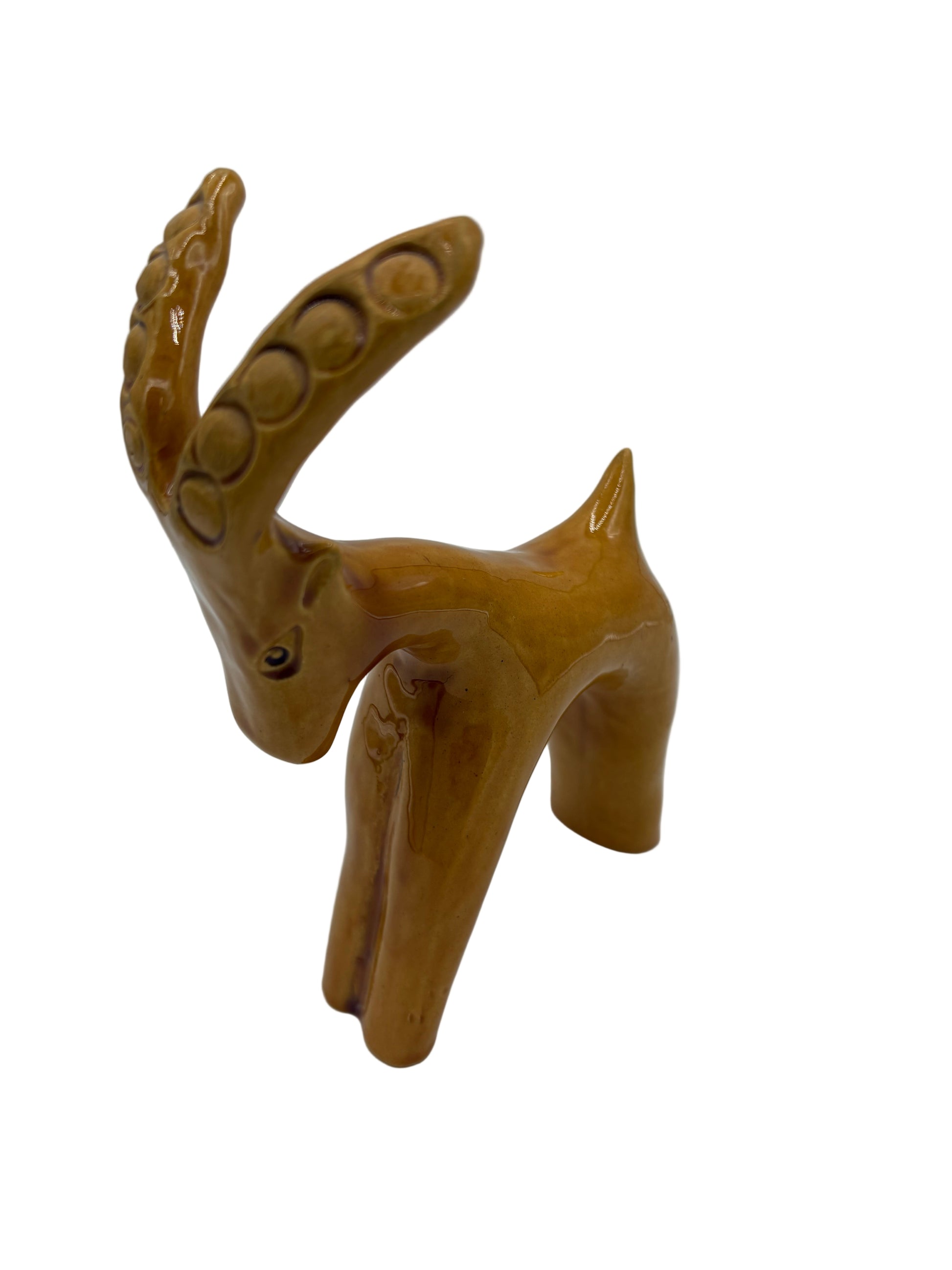 La pièce représente un bouquetin stylisé, aux formes épurées et harmonieuses. Réalisée en terre cuite émaillée d’un ton miel chaud, elle se distingue par son modelage fluide et ses cornes spiralées ponctuées de reliefs circulaires, évoquant à la fois la puissance et la douceur de l’animal.