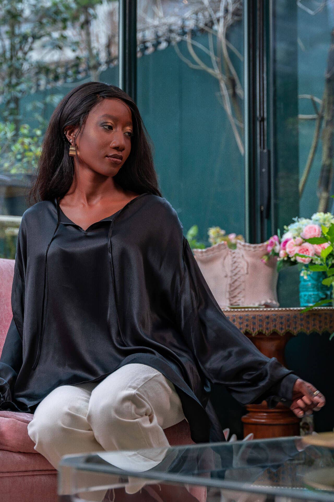 Le port de ce chemisier en soie évoque une époque révolue où la soie est un tissu, mais également un symbole de richesse, de statut et d'échange culturel. Elle incarne l'héritage de l'impératrice Hsi Ling Shih, vénérée comme la « déesse de la soie », dont la curiosité a donné naissance à une industrie qui allait façonner les économies et jeter un pont entre les civilisations.