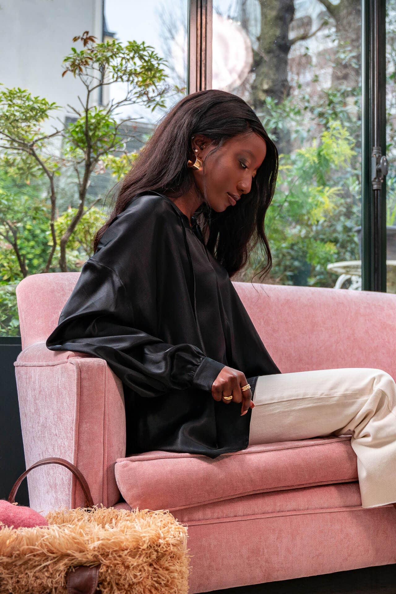 Incarnant la beauté éthérée et le savoir-faire exquis synonymes de la soie chinoise, ce chemisier, tissé à partir des cocons délicats des vers à soie, présente une translucidité qui capte et diffuse la lumière comme les brins chatoyants dont l'impératrice a été témoin. Un seul fil, méticuleusement cultivé et tissé en une tapisserie d'élégance sans faille, constitue la base de cette tenue intemporelle.