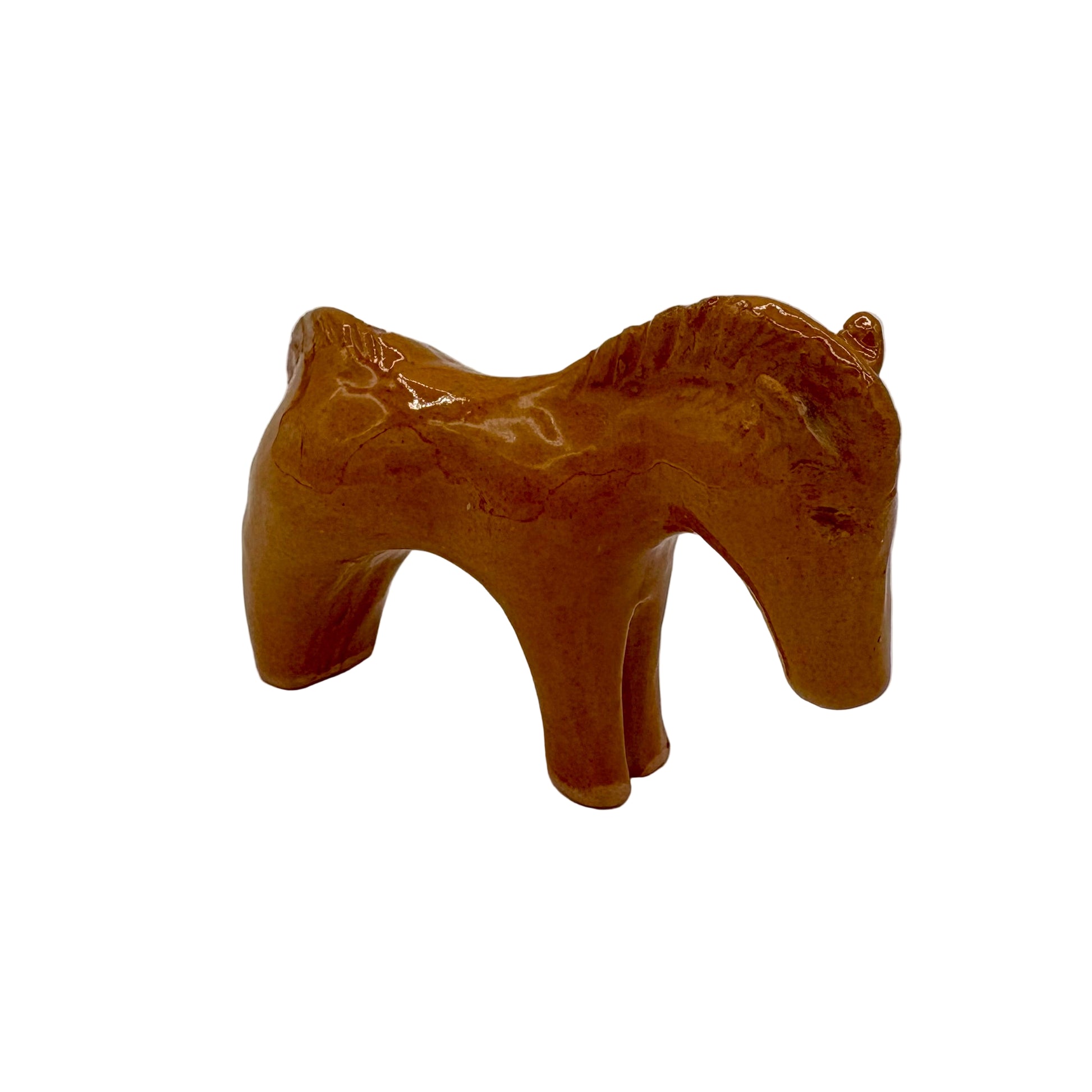 La pièce, d’environ dix centimètres de long, est modelée dans une forme épurée qui met en valeur la silhouette robuste et paisible de l’animal. Sa glaçure brillante, dans une teinte miel légèrement nuancée de rouge, souligne les volumes et confère à l’ensemble une chaleur particulière.