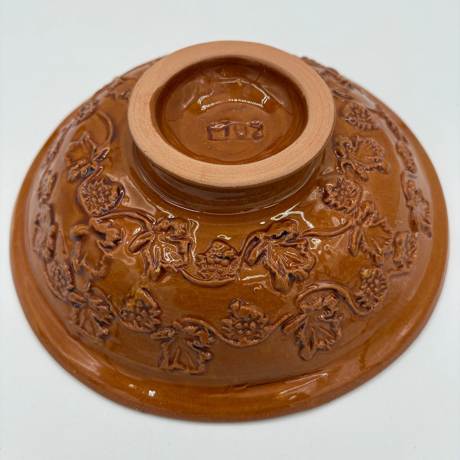 La glaçure miel, profonde et brillante, met en valeur le relief du décor et rappelle la chaleur des terres méditerranéennes. Chaque assiette est moulée et finie à la main, rendant chaque exemplaire unique.