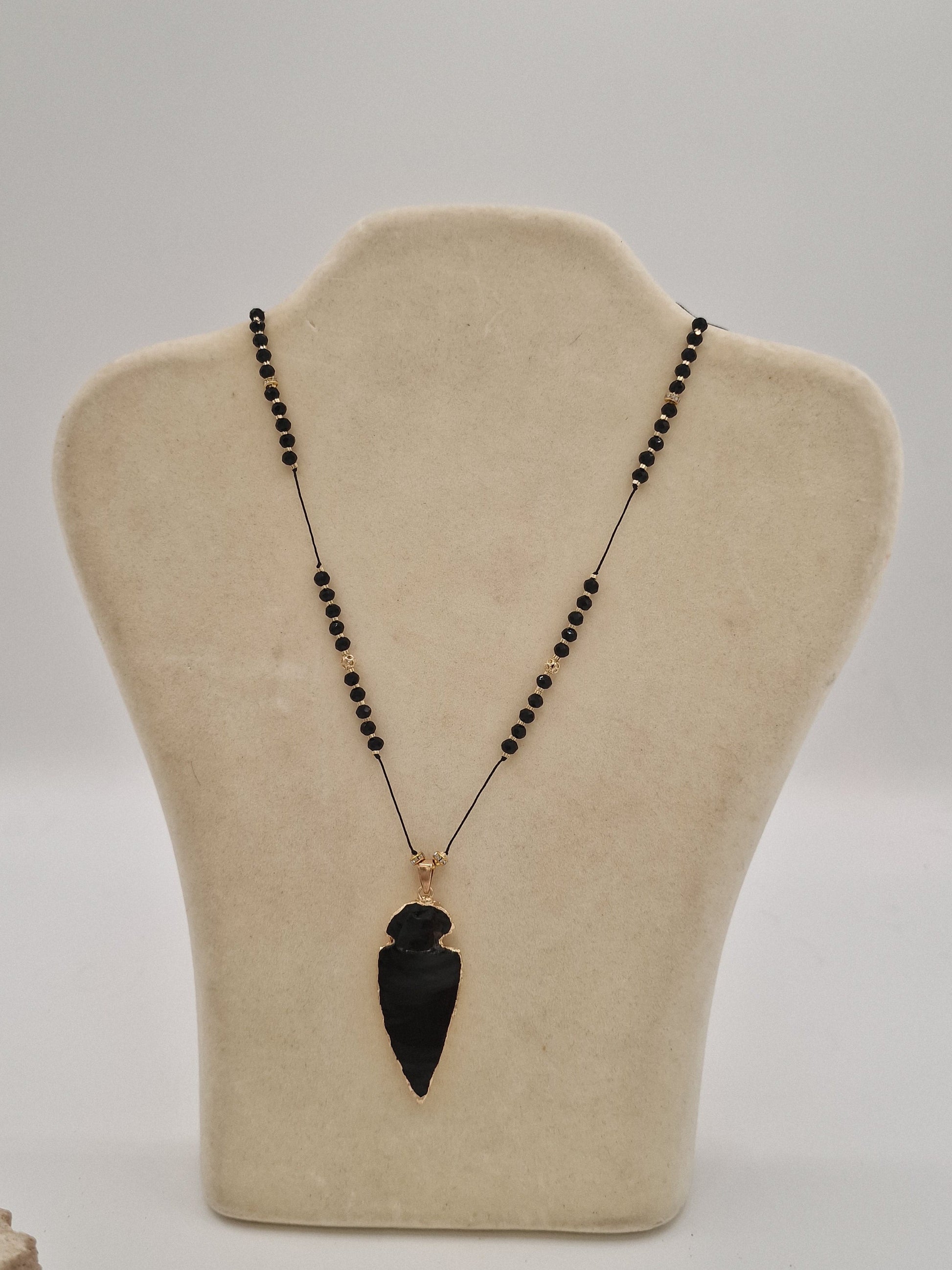 Collier pendentif pointe en obsidienne et perles noires dorées