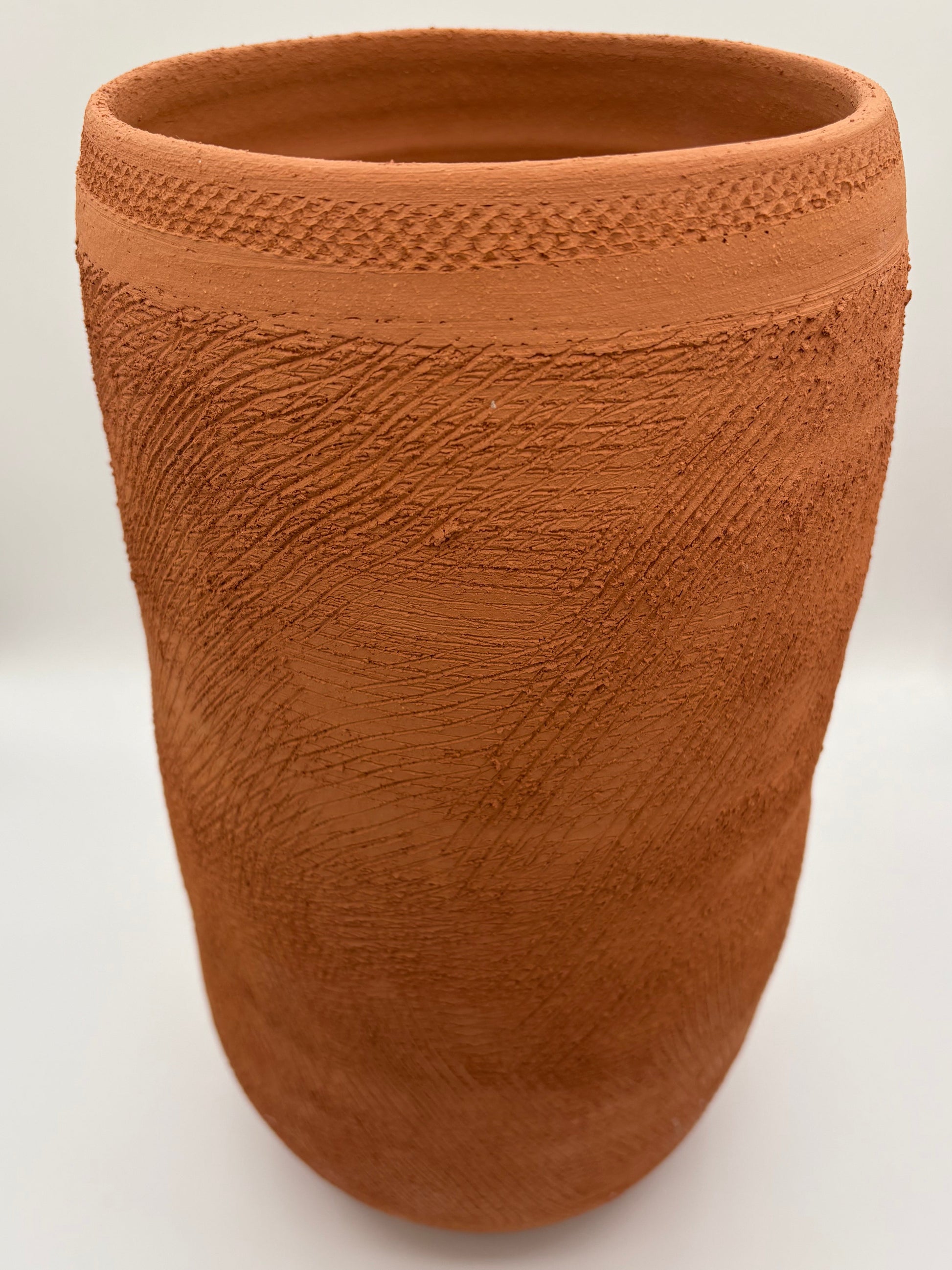 Ce grand pot en terre brute se distingue par sa surface finement striée et sa texture mate, laissée volontairement sans émail pour révéler la pureté de la matière. Les traces du tournage et des outils dessinent un motif vivant, presque tissé, qui capte la lumière avec subtilité. Une pièce sobre et puissante, à la beauté minérale et intemporelle.